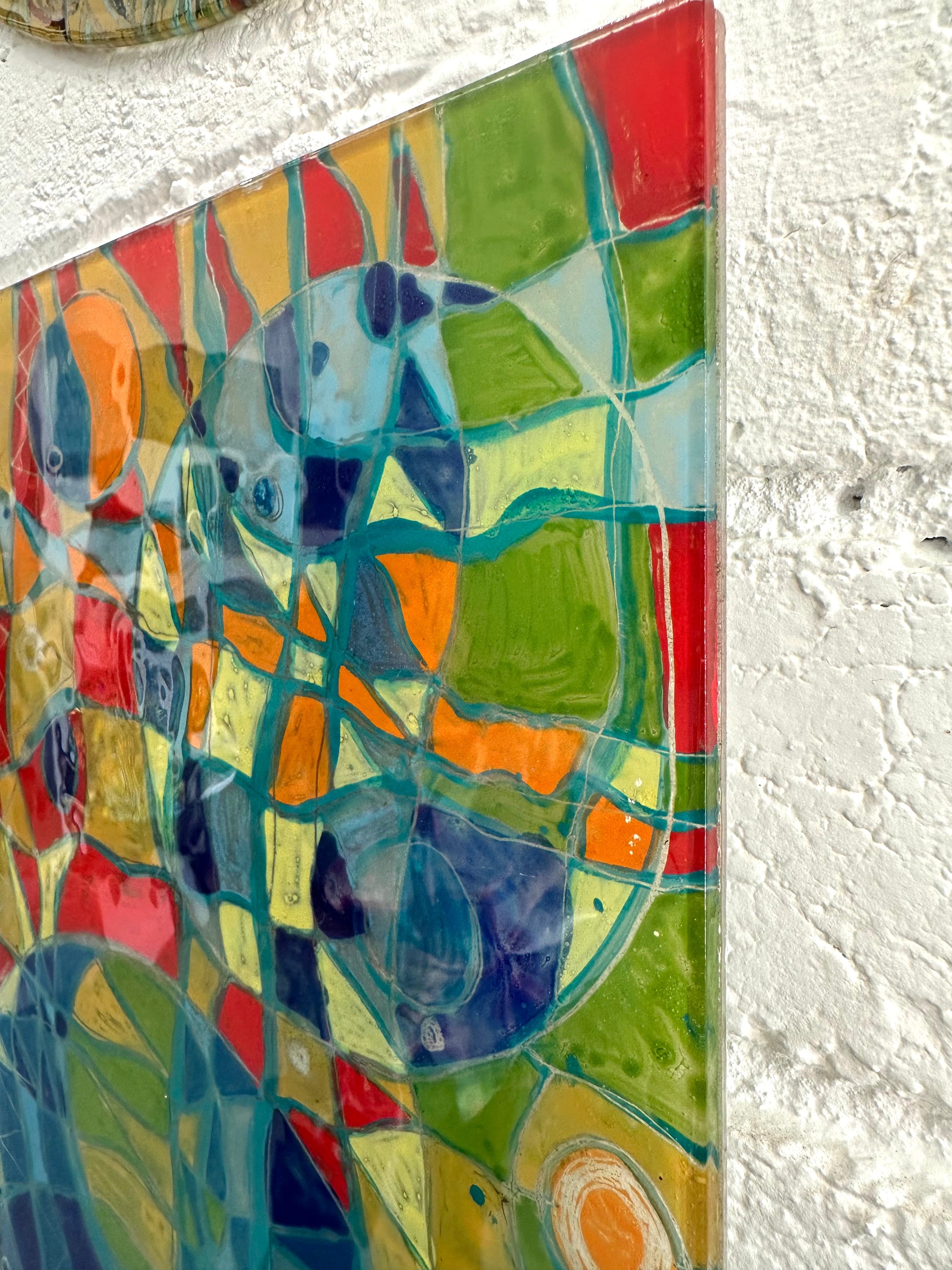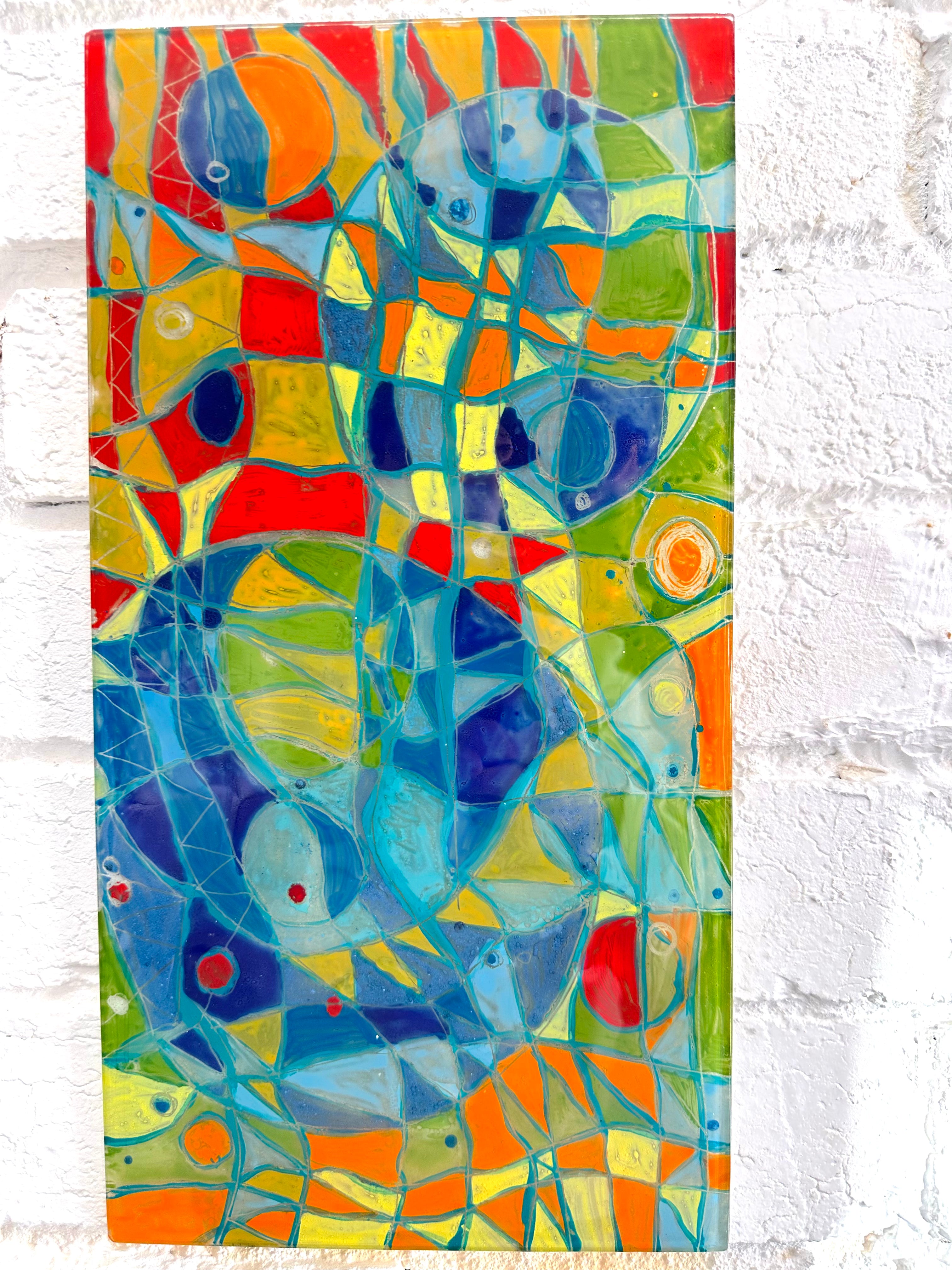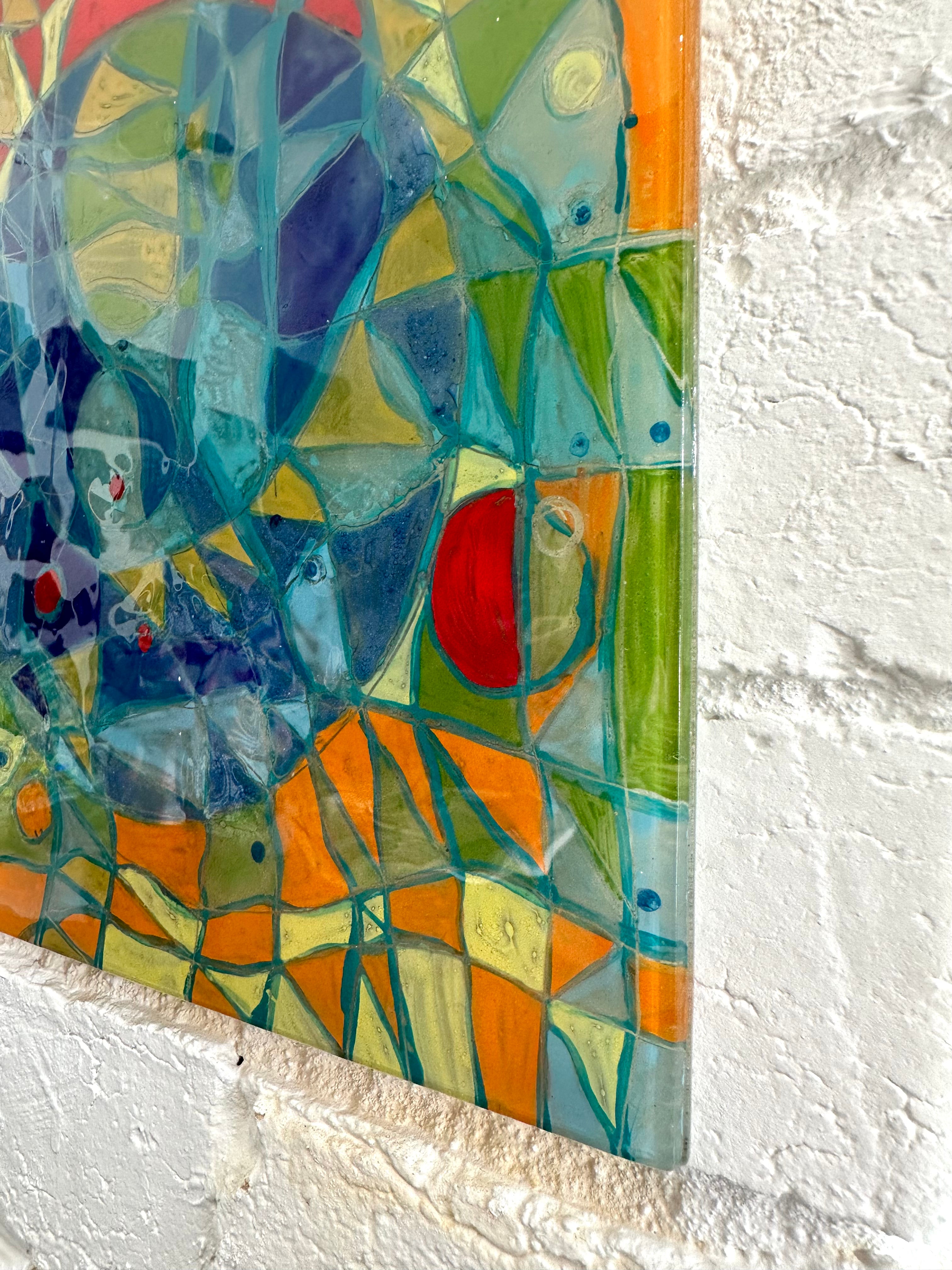 Interlocking shapes in turquoise, cobalt blue, citrus yellow, fiery red, and fresh green flow across the surface like a living mosaic. Fine linear details connect each form, creating rhythm and continuity, while translucent layers allow light to travel through the glass—revealing new color interactions from every angle.