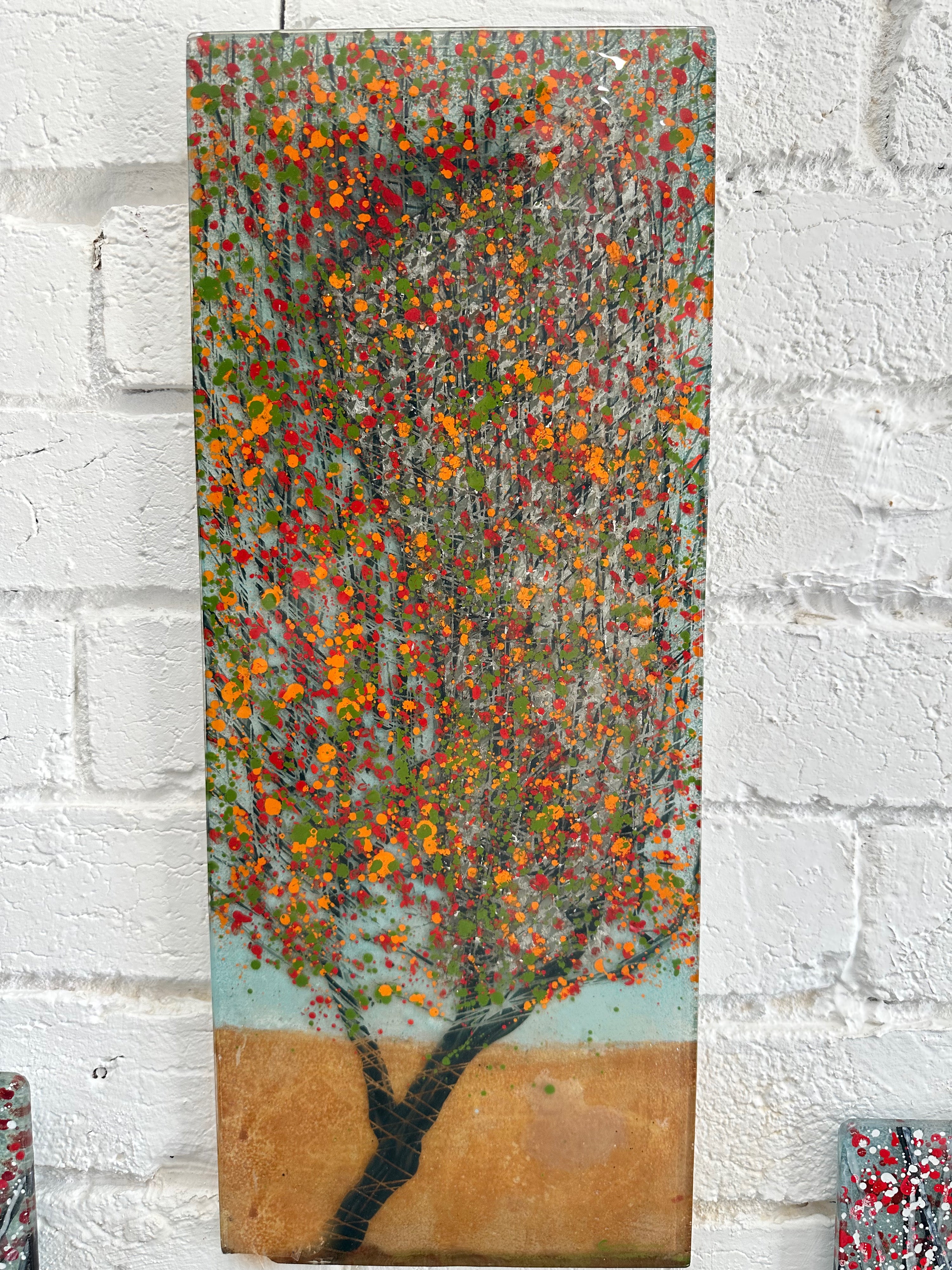 This handmade fused glass wall panel features a vibrant, nature-inspired abstract tree design.