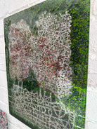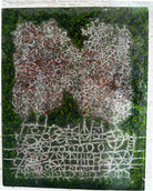 Two softly textured forms rise from a deep green field, evoking trees, memories, or figures rooted in the same ground. Beneath them, a delicate layer of linear markings suggests foundations, pathways, or traces of time—subtle yet grounding.