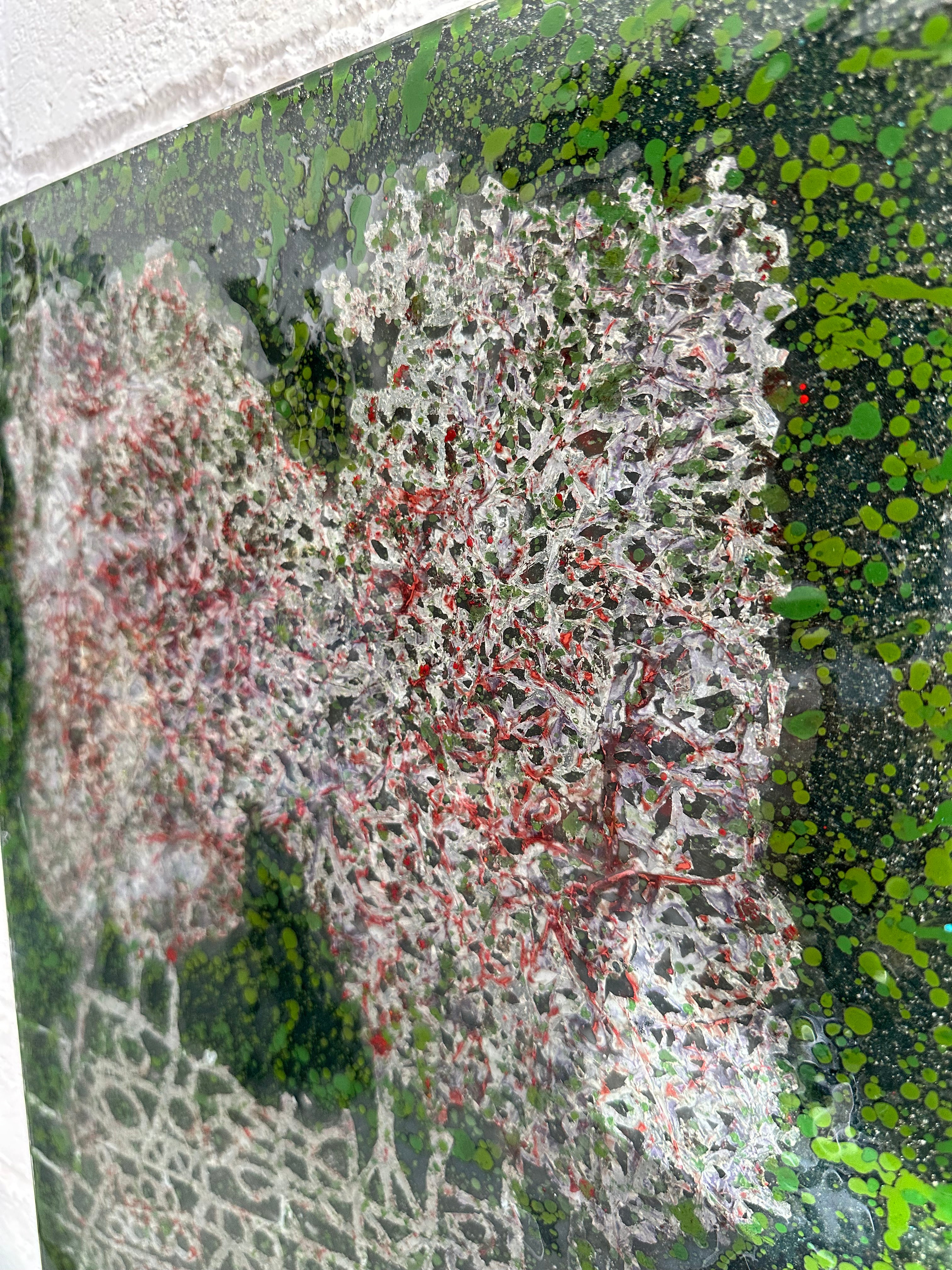 The surface is rich with fine glass granules and layered translucency, allowing light to gently shift across the piece throughout the day. Each detail is built by hand and kiln-fused, making this artwork entirely unique.