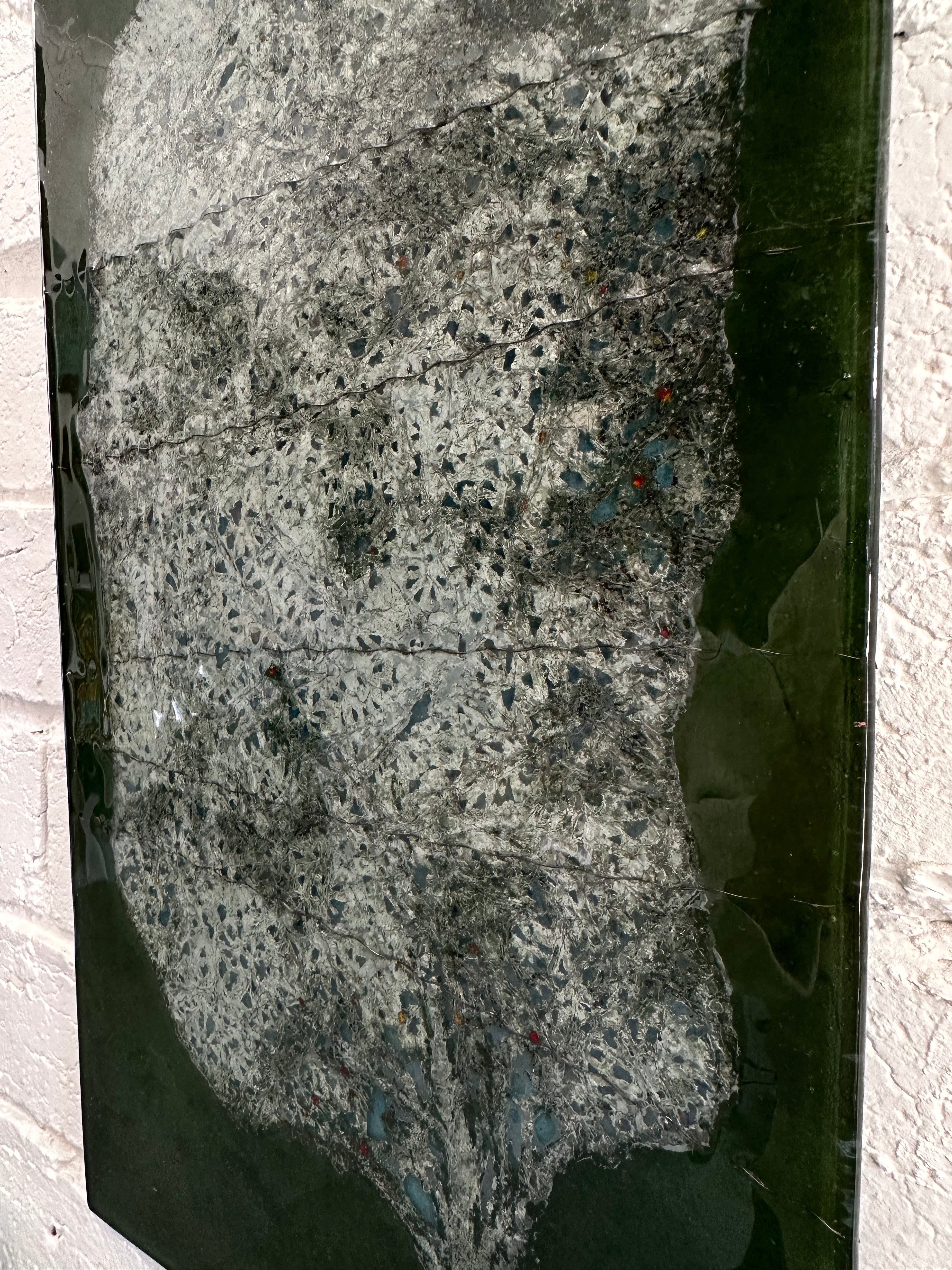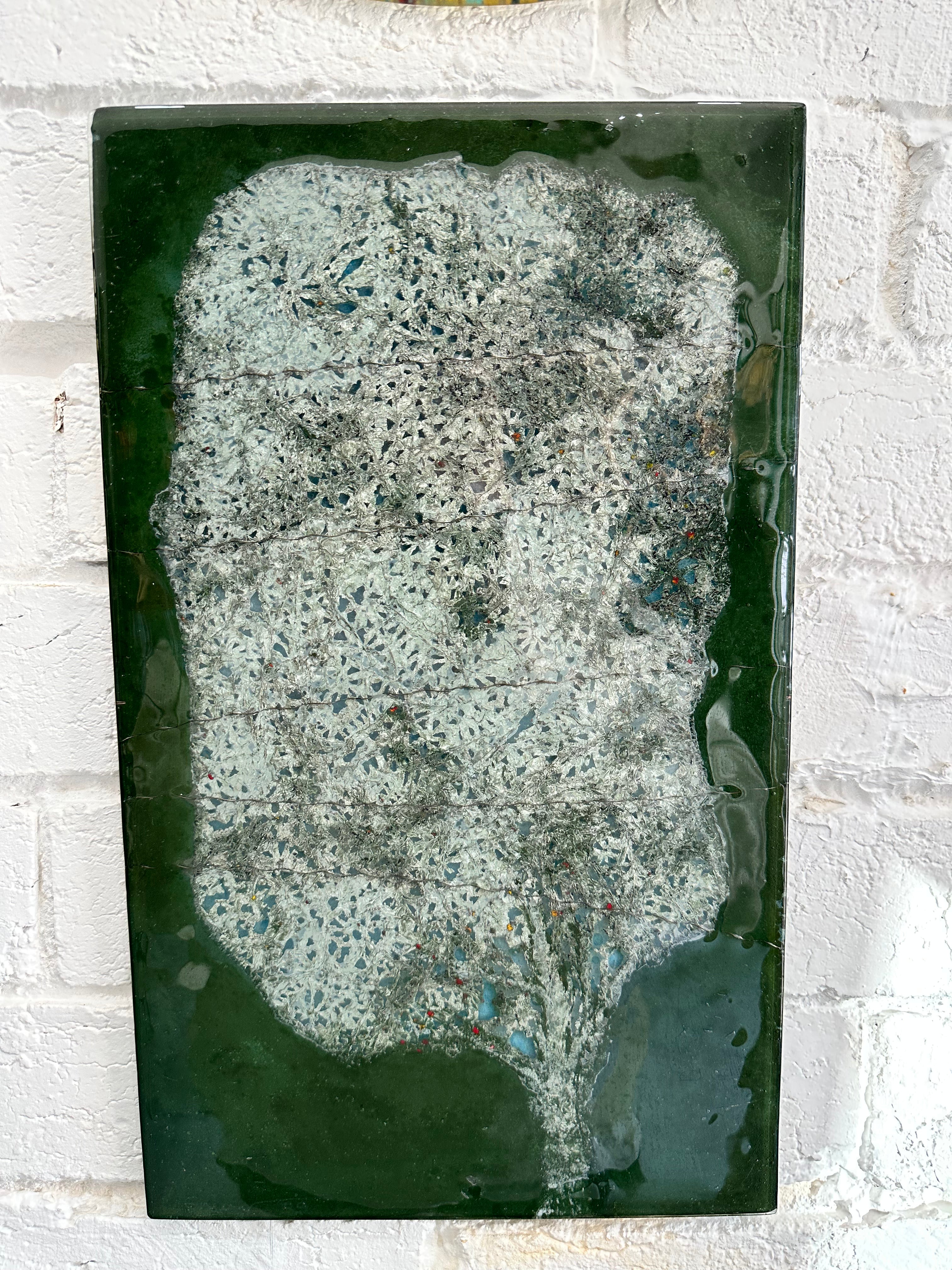 A softly textured, stone-like form emerges from deep green glass, creating the impression of an ancient tree or organic landscape suspended in time. Subtle mineral tones and scattered inclusions are fused into the surface, giving the piece a natural, weathered character that shifts gently with changing light.
