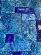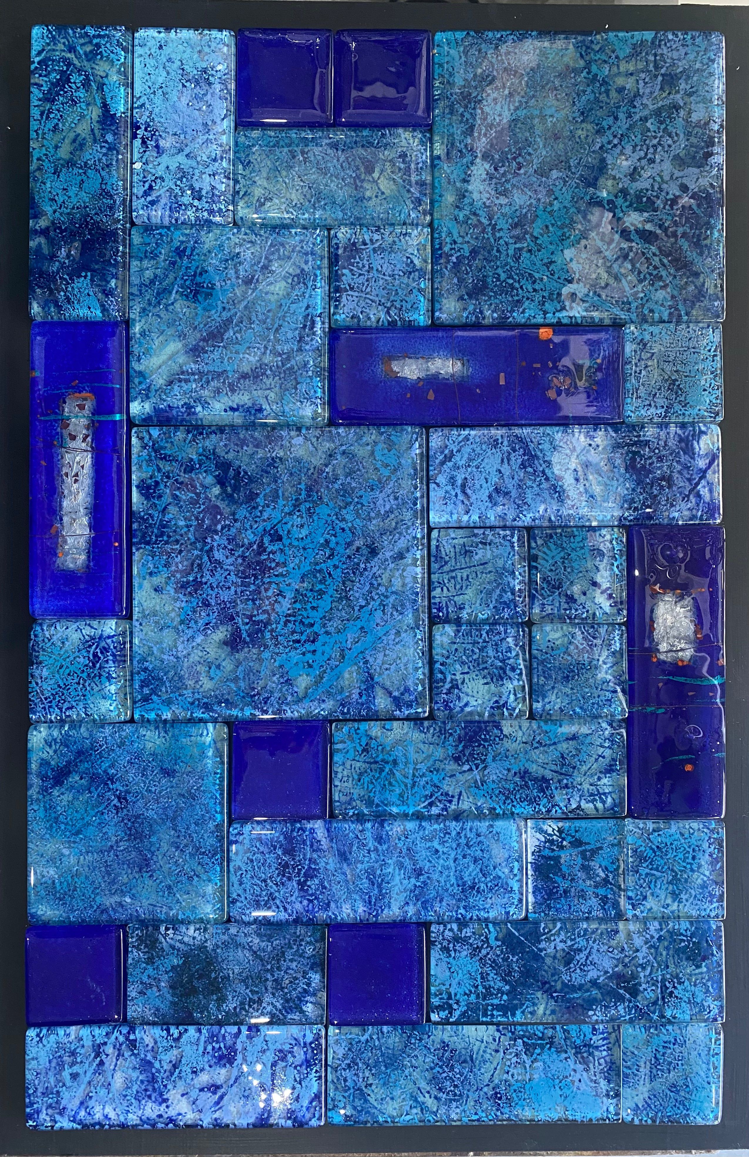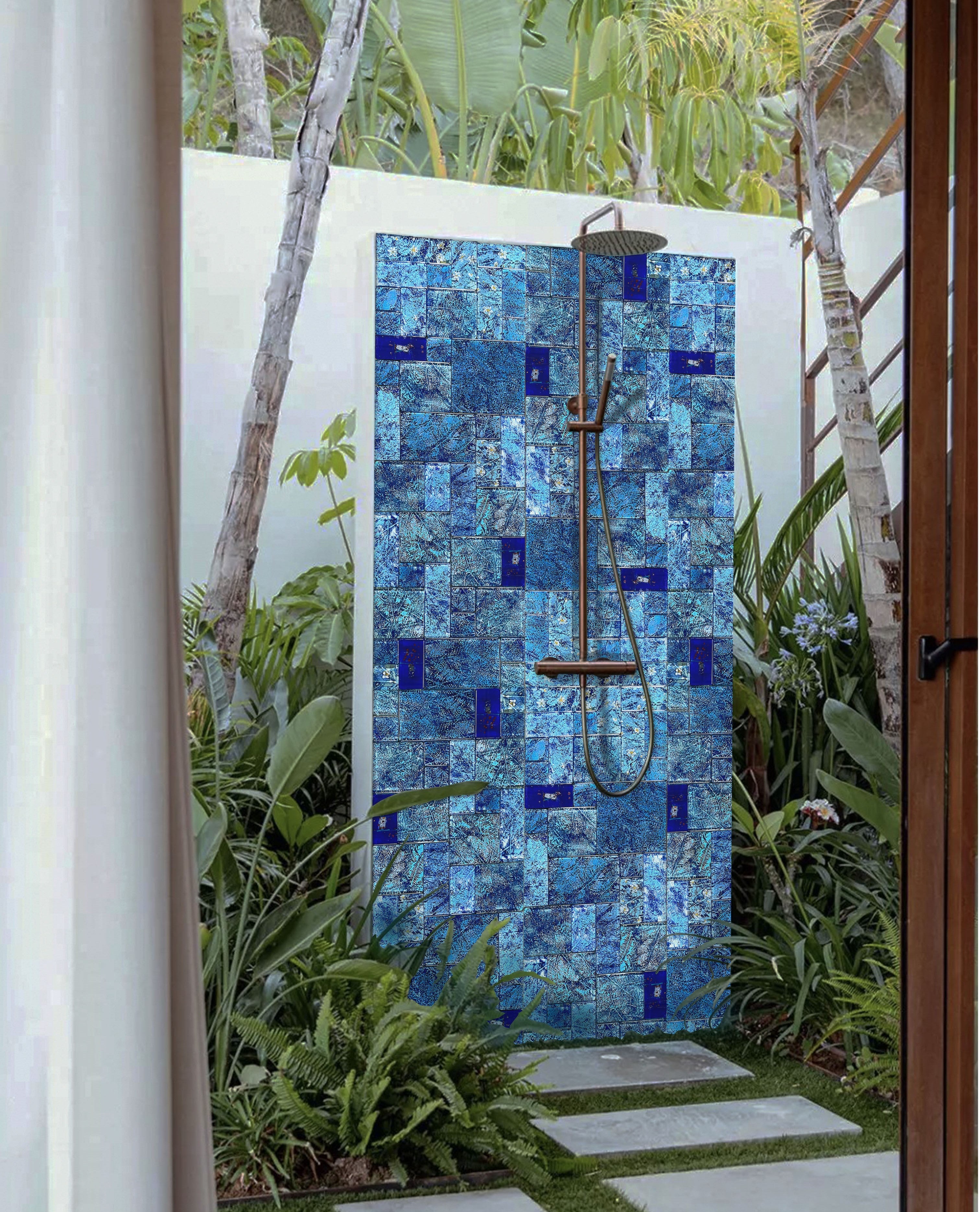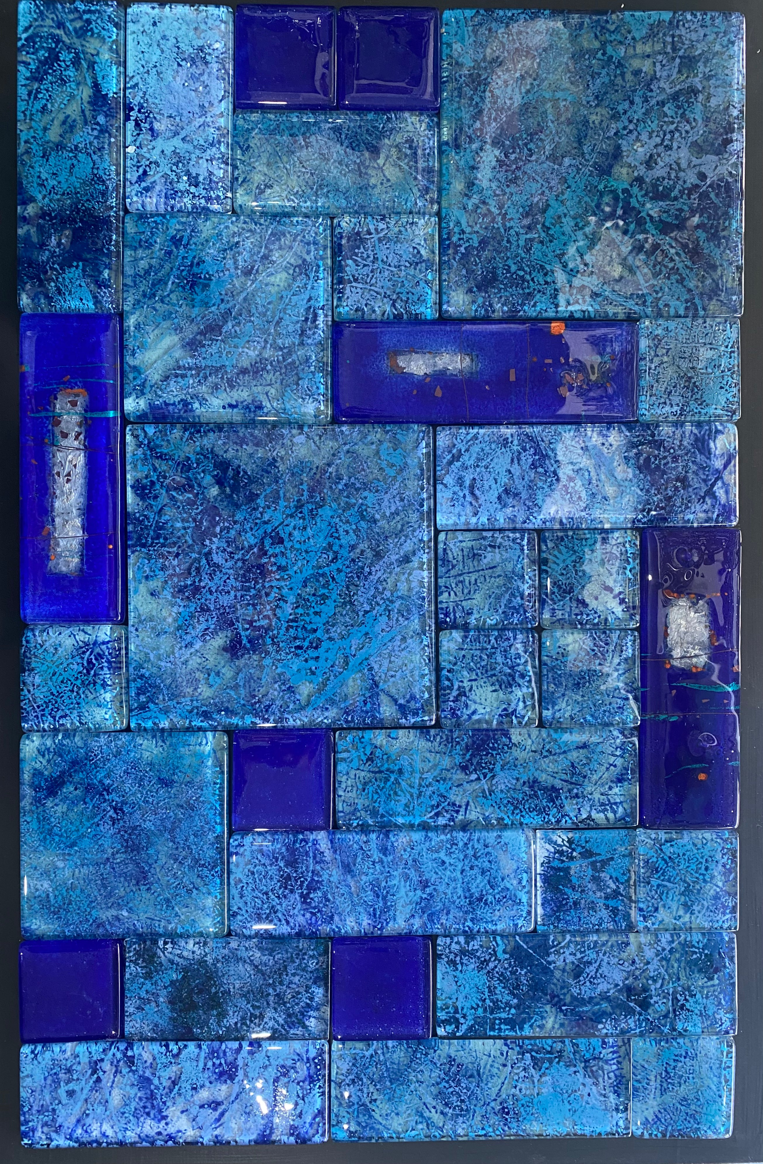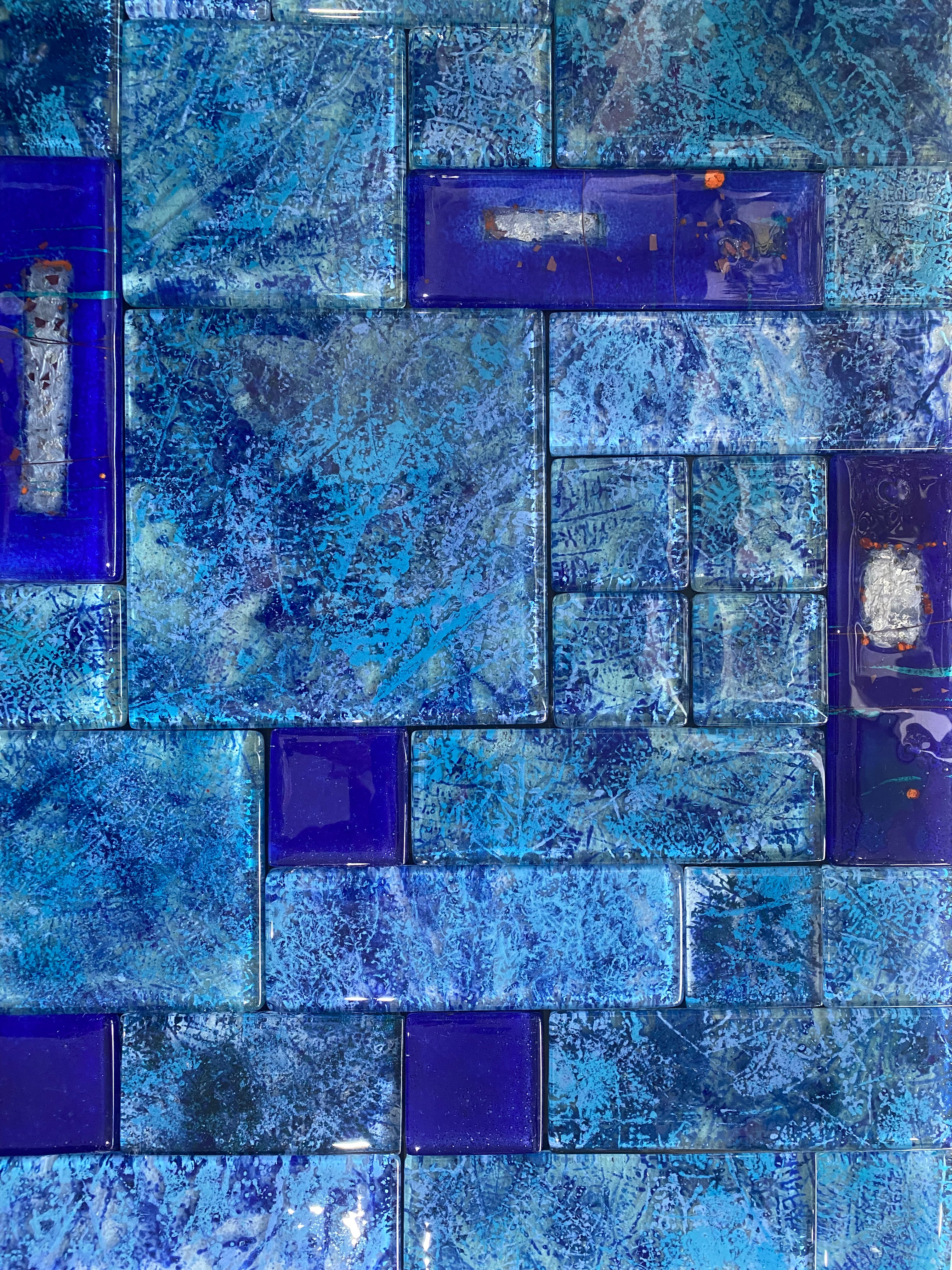 In our atelier, we weave cobalt blue alongside a spectrum of blues to craft unique tile blends. Among these, some smaller tiles showcase pure cobalt in its fullest strength. We’ve reimagined this vibrant cobalt energy by entwining it with shimmering silver foil, delicate copper flakes, and fine wire fragments, creating a design that sparkles with new life.