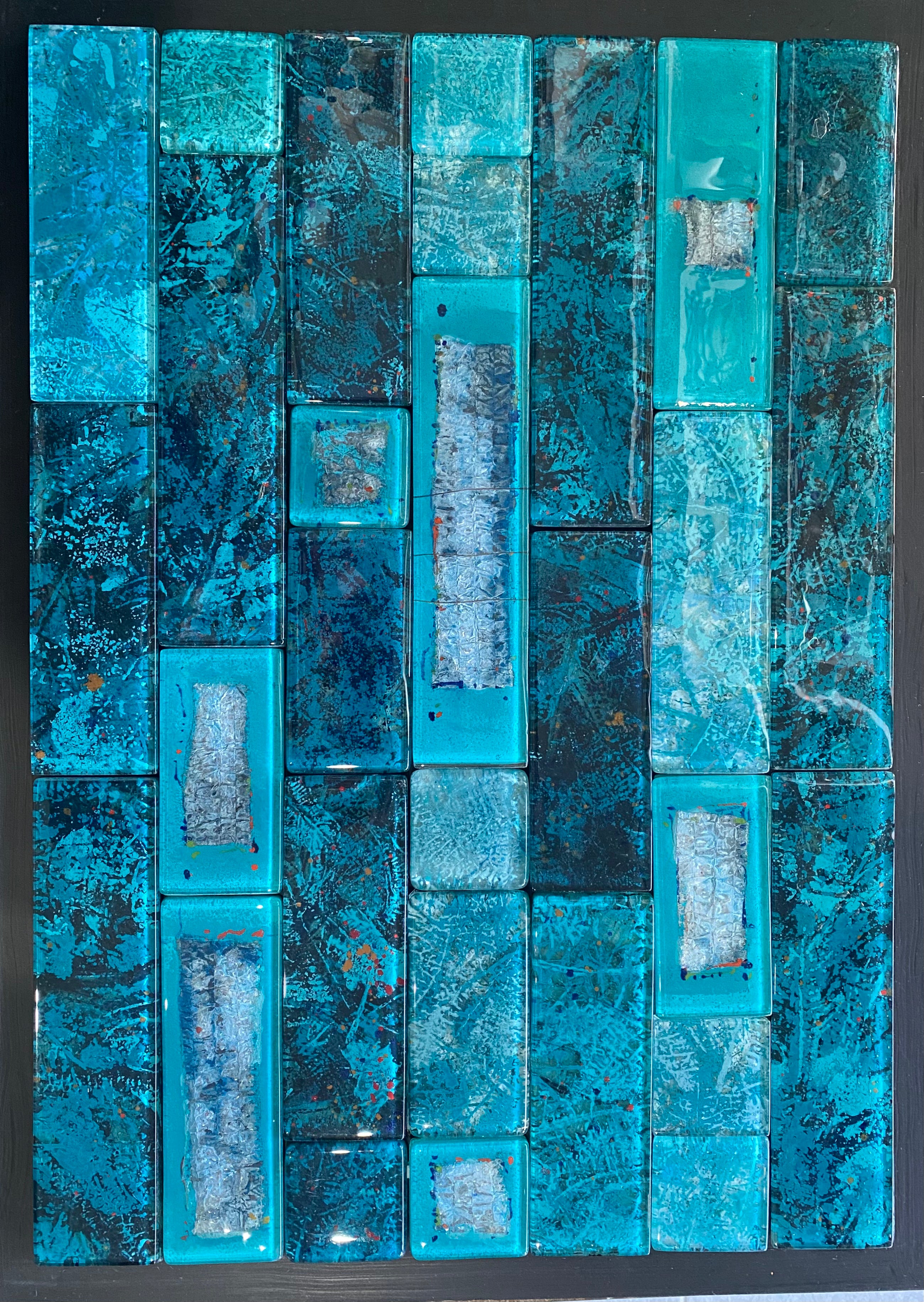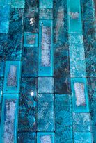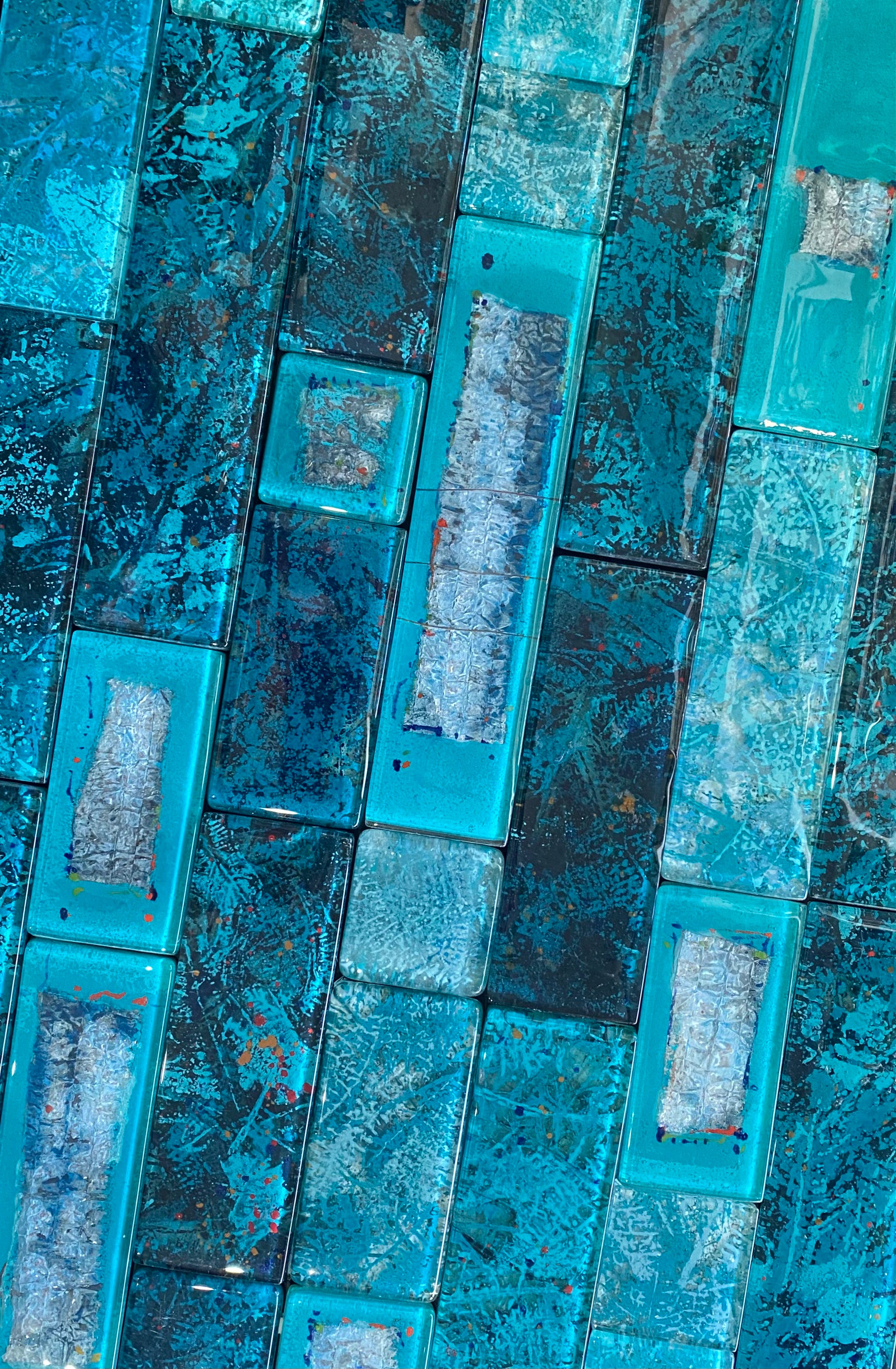 To capture this poetic effect on glass, we combined turquoise tones with subtle silver accents, arranging long tiles in the same direction, attempting to mirror that same shimmering movement. This mix, especially when used for shower splashbacks in bathrooms, can create a stunning, tranquil atmosphere that evokes the same enchanting beauty of the sea’s glow.