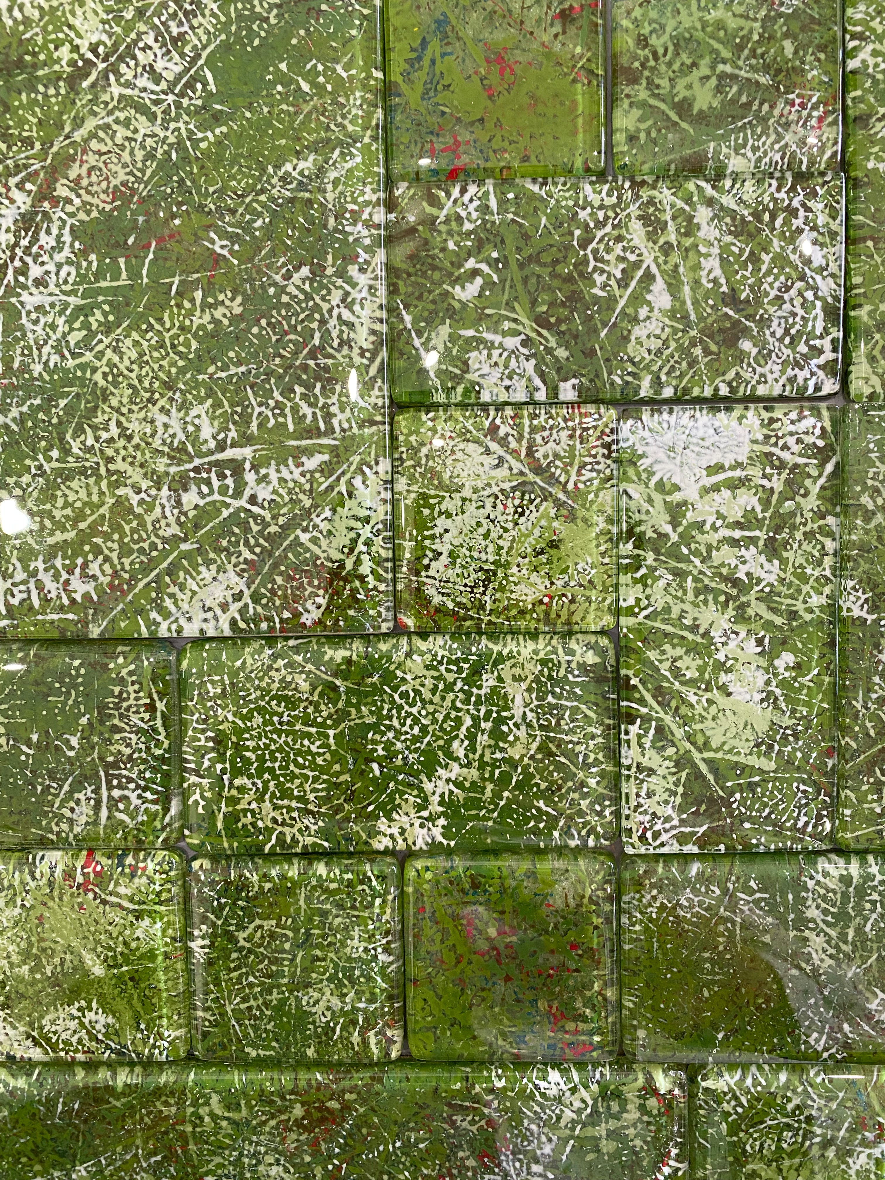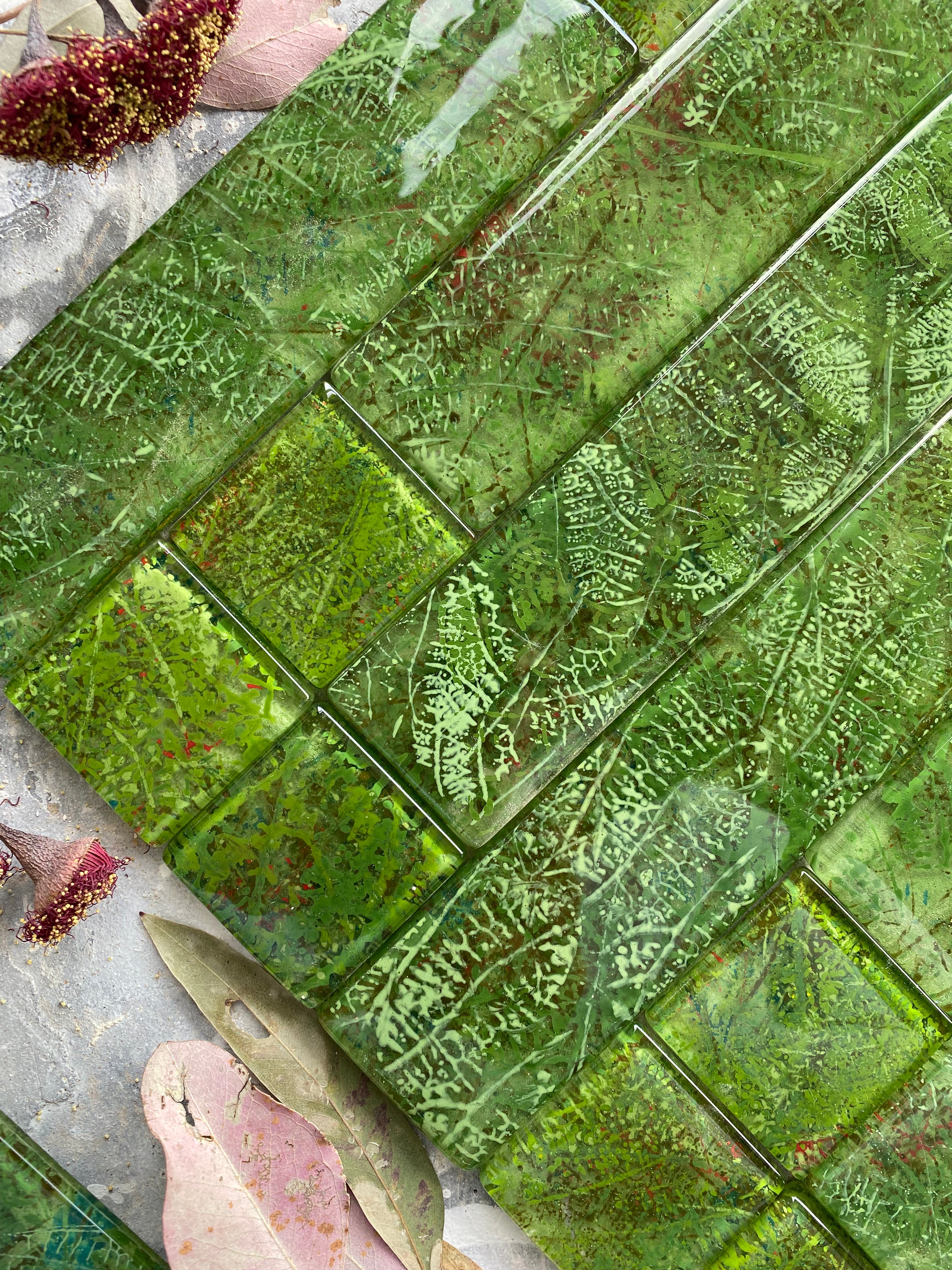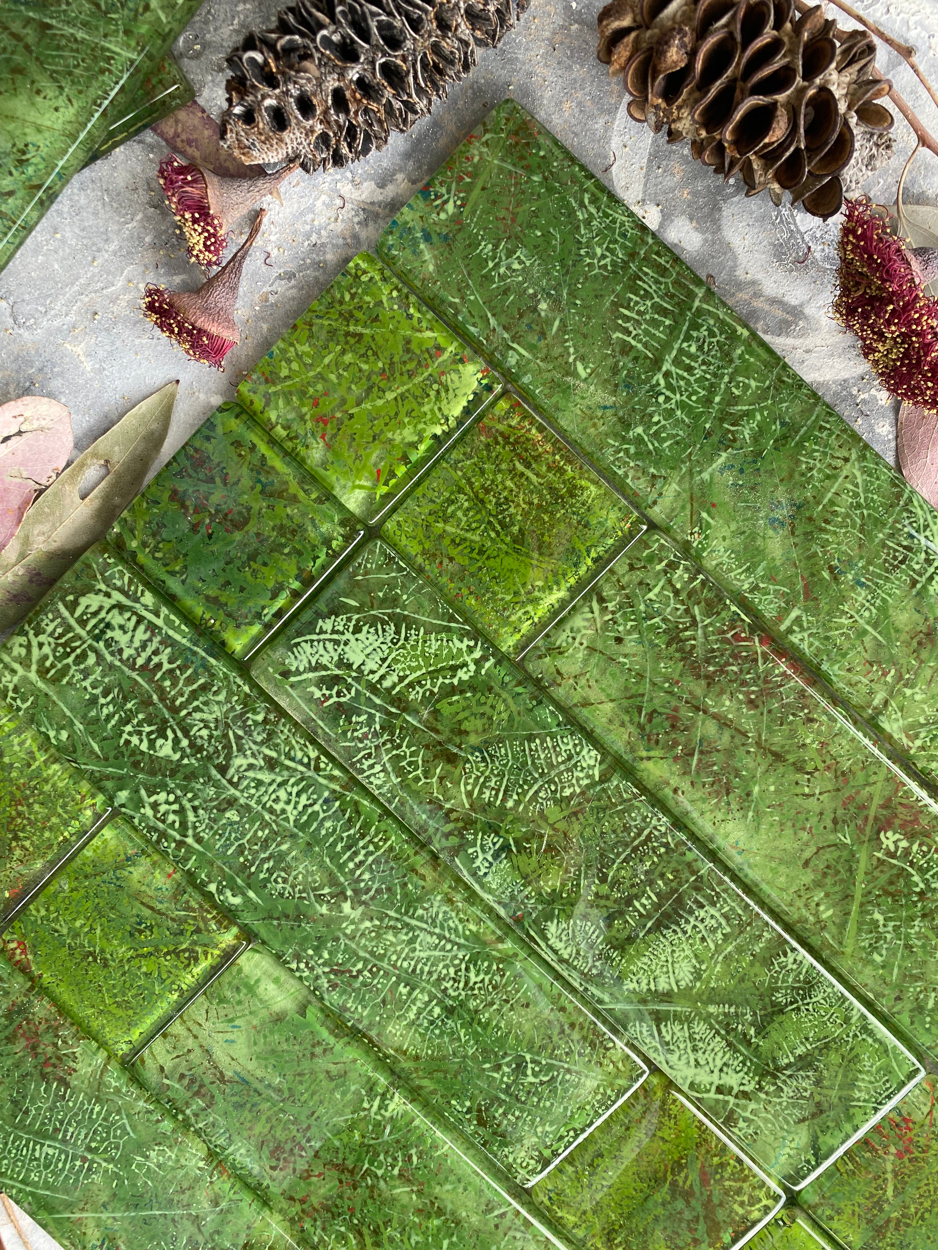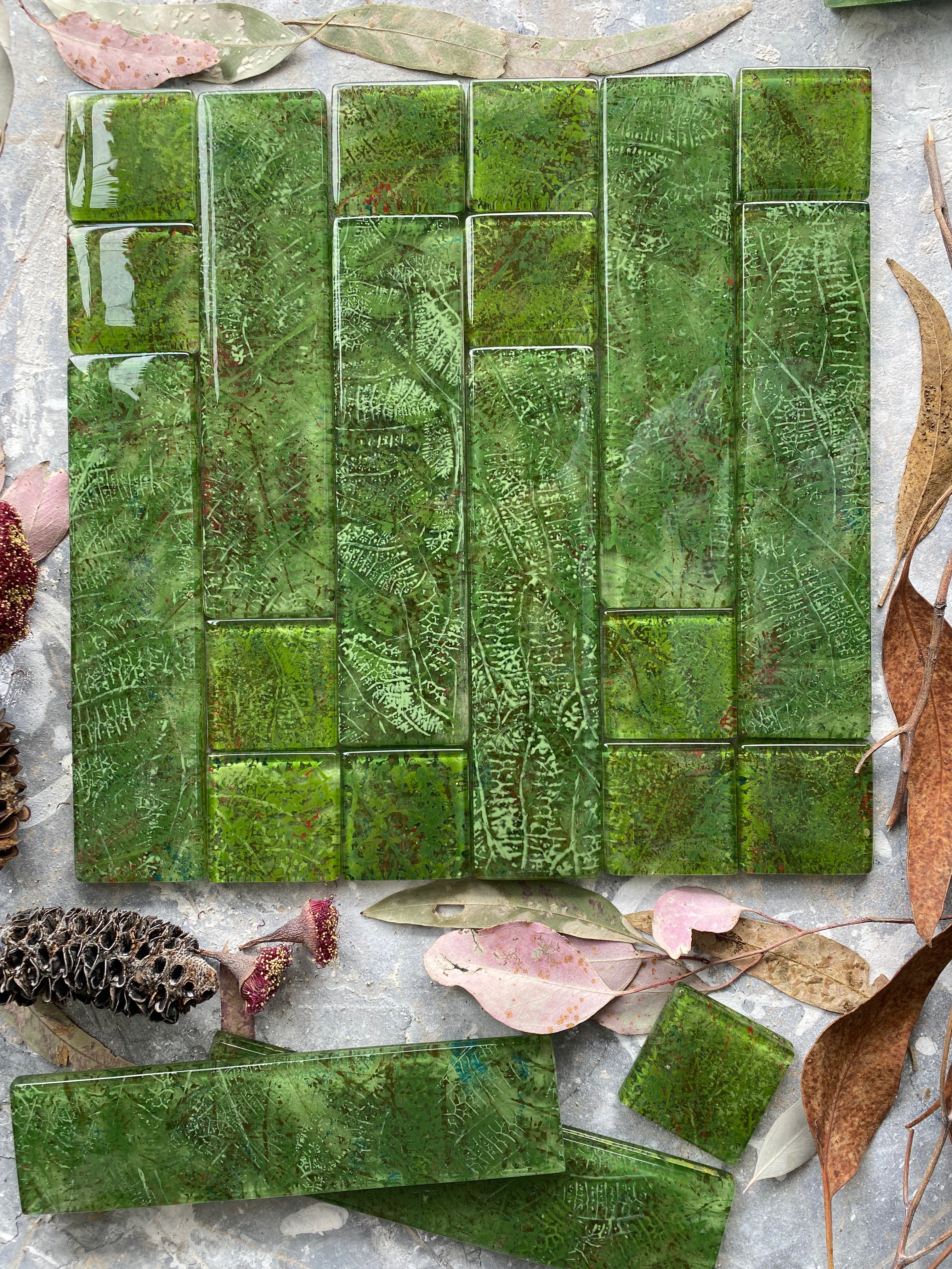 All colors used are proprietary blends, meticulously formulated and scaled in our workshop. These glass tile designs, exclusive to our atelier, offer a novel alternative to traditional glass mosaics and splashbacks.