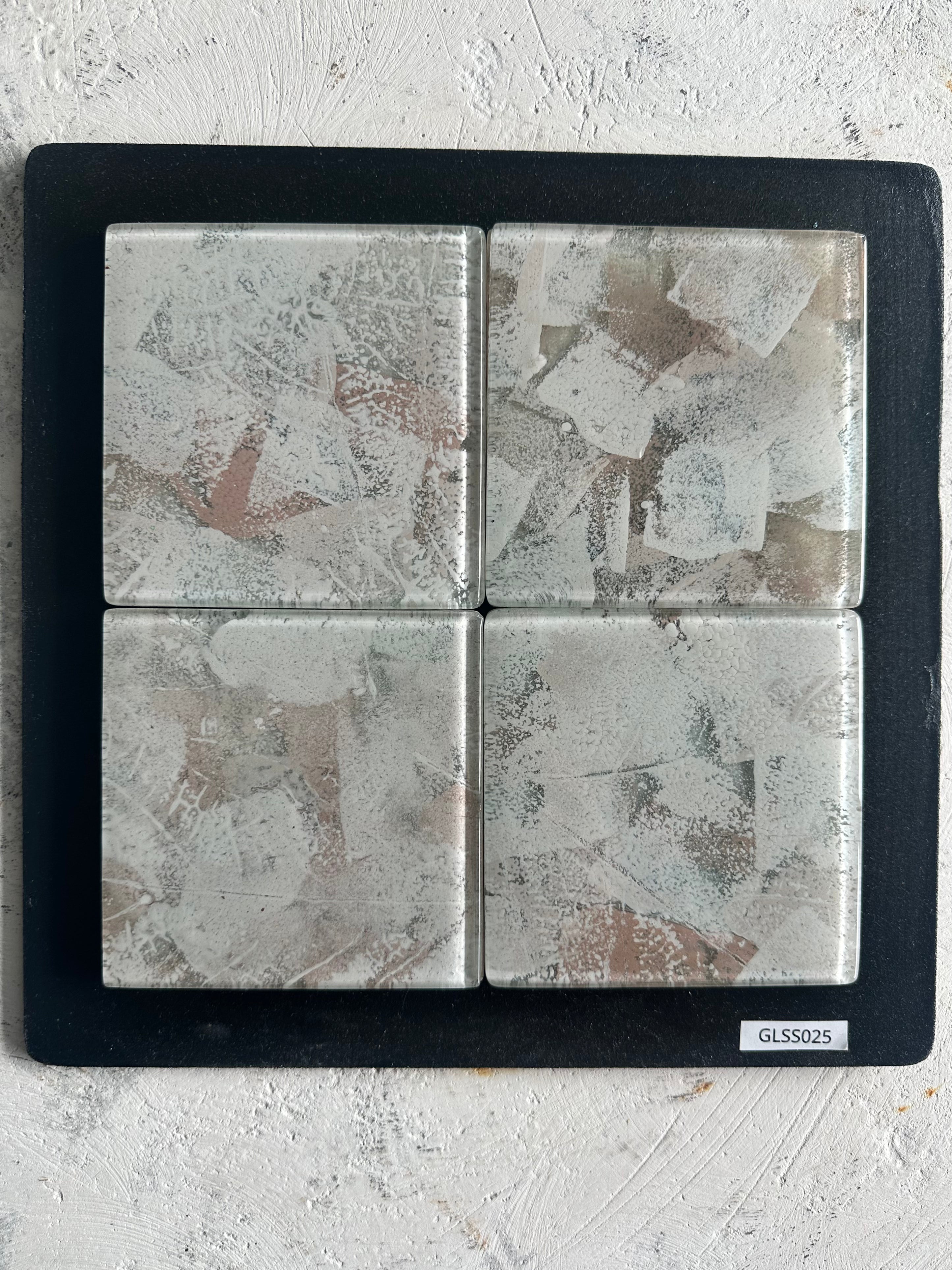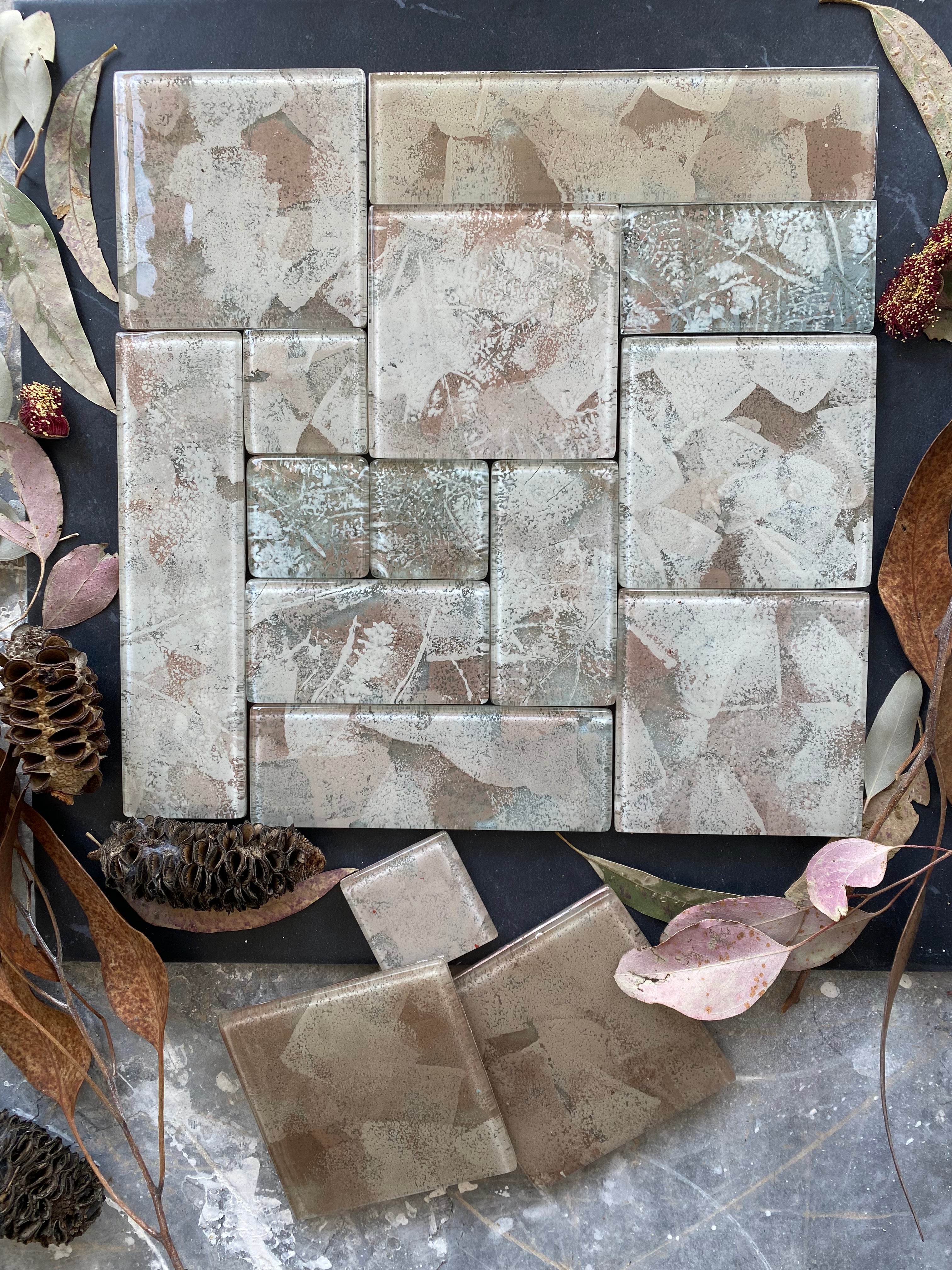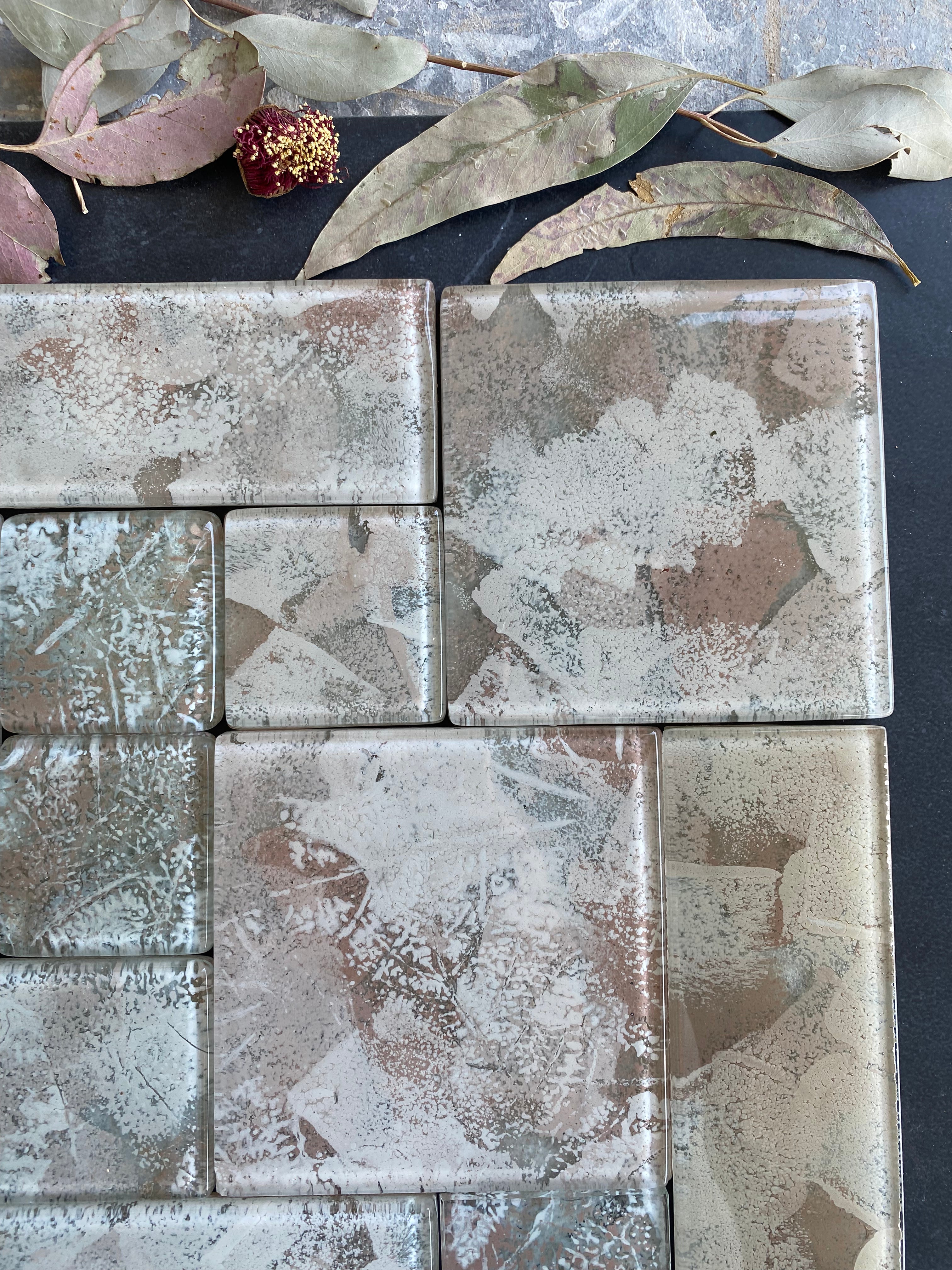 All colors used are proprietary blends, meticulously formulated and scaled in our workshop. These glass tile designs, exclusive to our atelier, offer a novel alternative to traditional glass mosaics and splash backs.