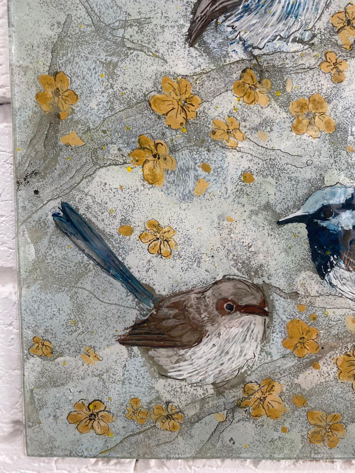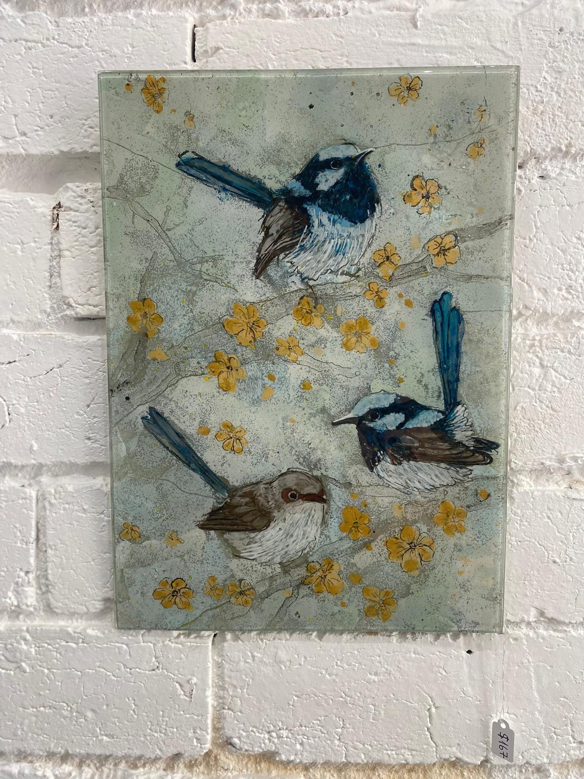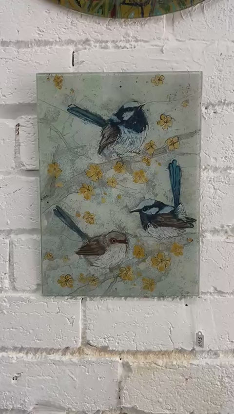 This handmade fused glass artwork features two birds surrounded by delicate floral details, inspired by nature and seasonal blooms.