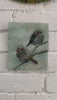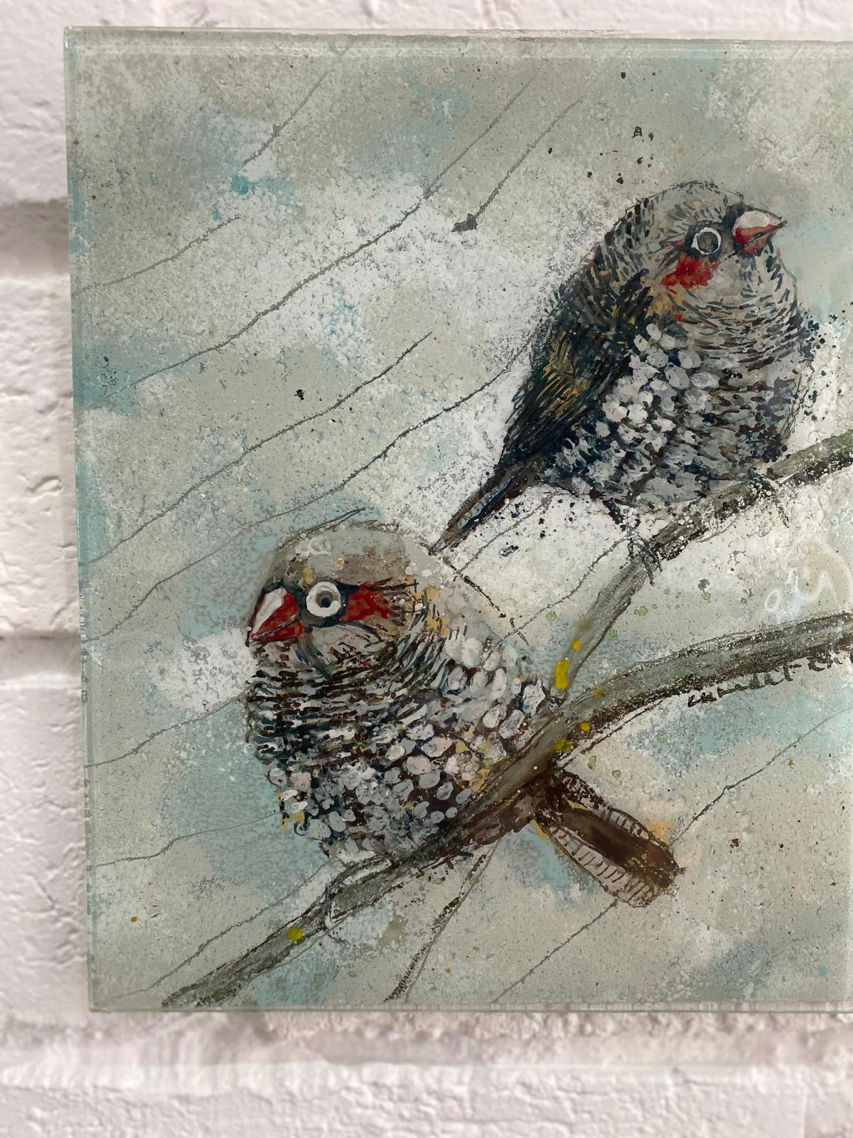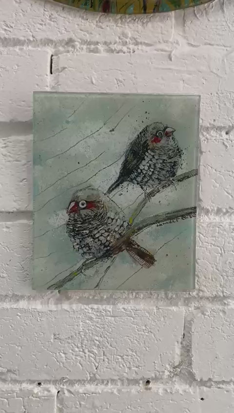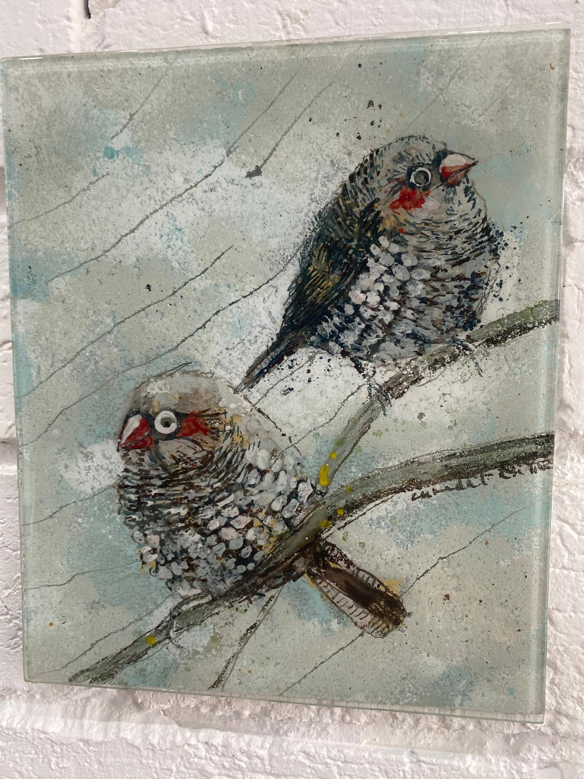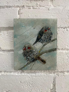 The soft, muted background and gentle textures create a calm and intimate atmosphere, capturing a quiet moment in nature. Each bird is individually hand-painted and fused into the glass, giving the artwork depth, movement, and a tactile quality.