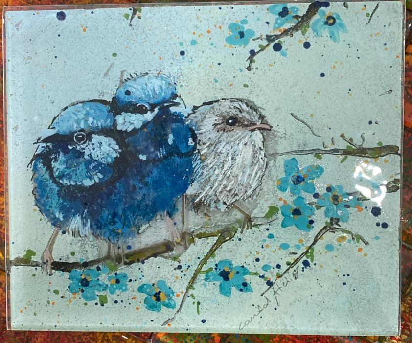 All off the our glass works are hand painting. Parmanent colours, paints are between the two glasses and at the bottom of the tiles. Able to use inside and outside. There are hangers on the back