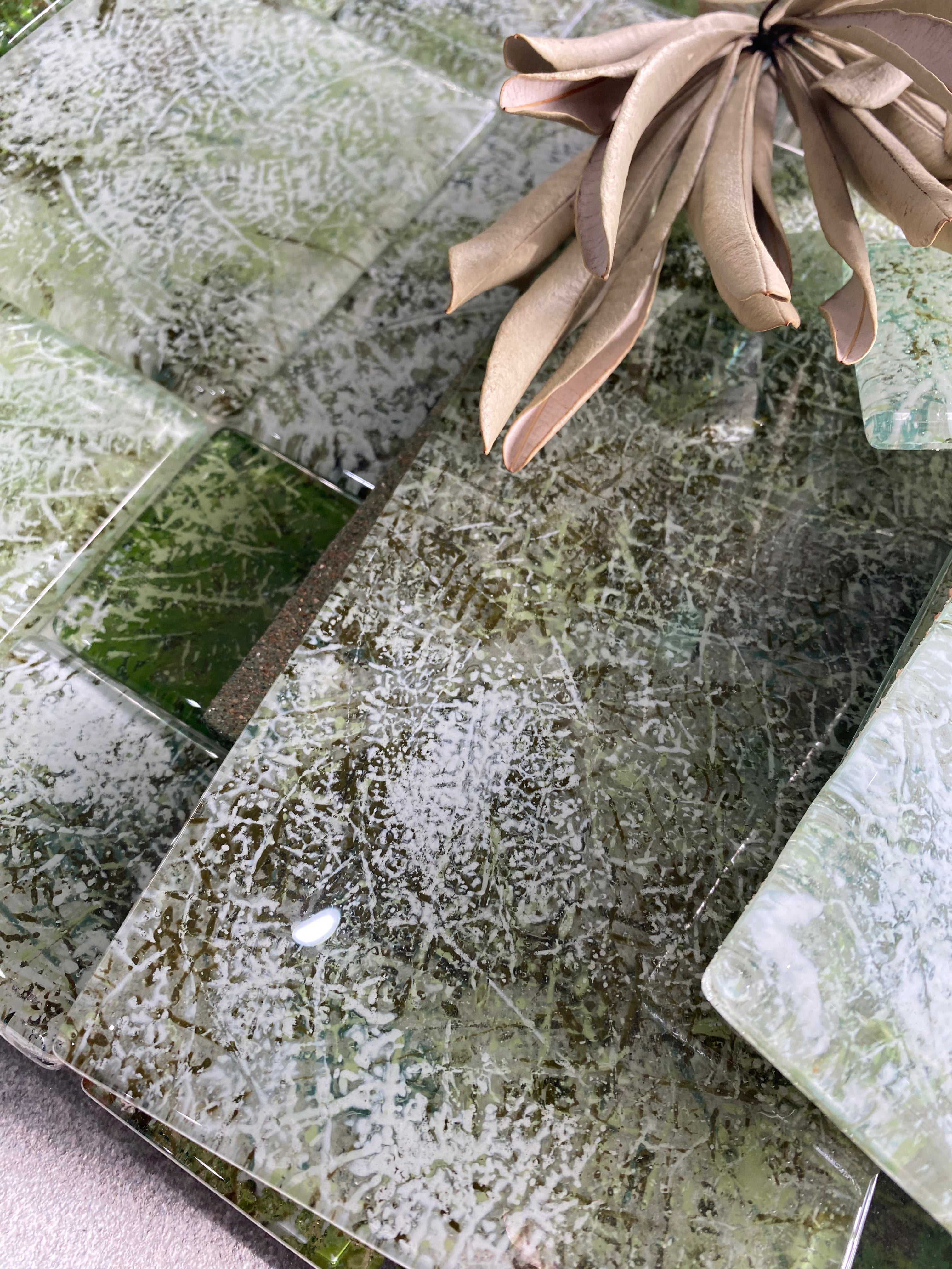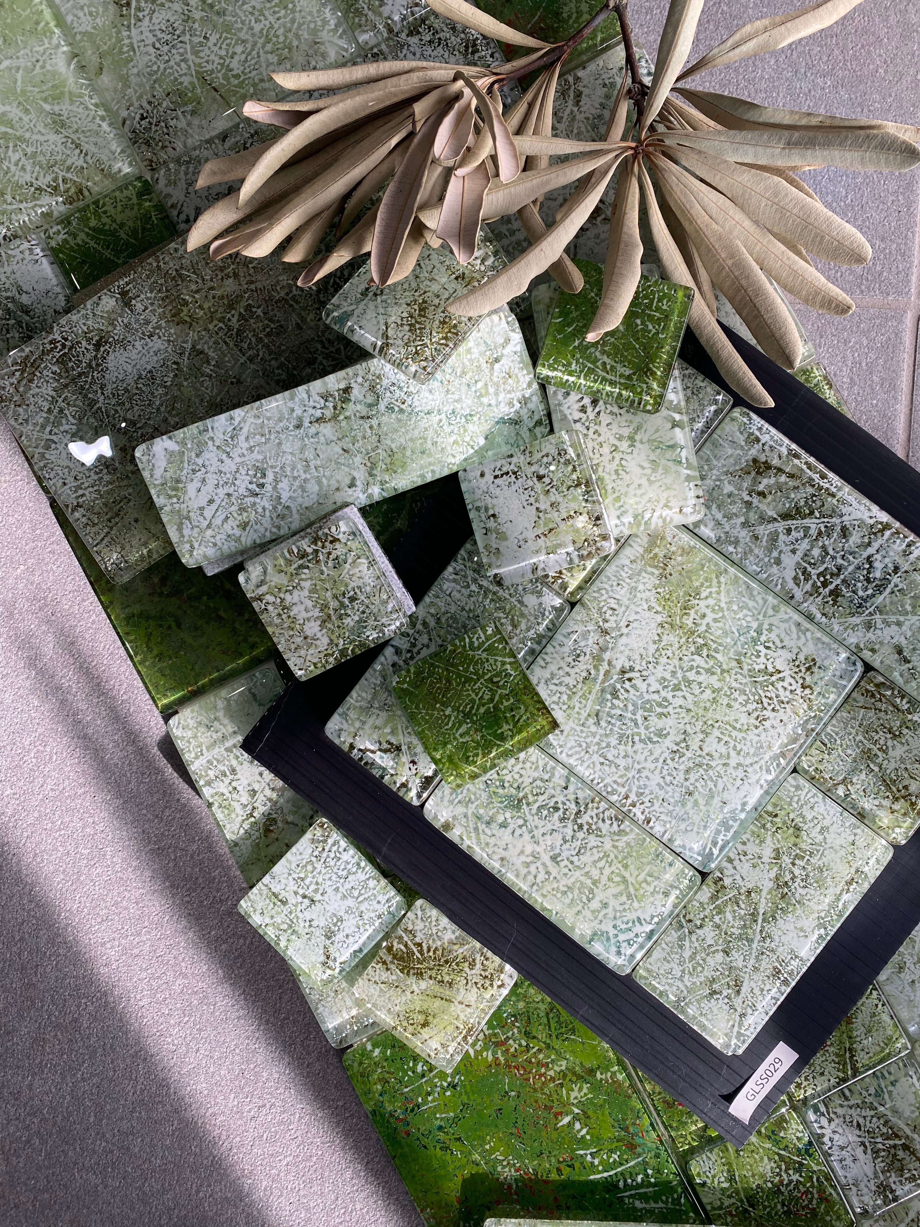 Available in single-glazed (soft, semi-reflective) and double-glazed (high-gloss, fully reflective) options. All colors are exclusive formulas created and mixed in our workshop, offering a distinctive alternative to traditional glass mosaics and splashbacks.
